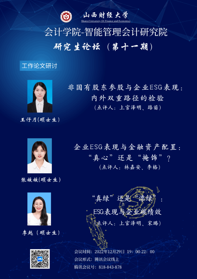 -智能管理会计研究院于2022年12月29日19:00-21:00举办第十一期研究生论坛。会议由王晓亮教授主持。参会人数七十余人。本期论坛主要研讨了王仔月、张媛媛及李越三位研究生的工作论文。