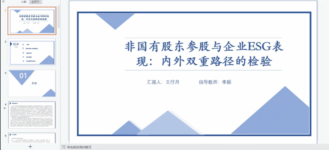 首先,硕士生王仔月汇报了工作论文《非国有股东参股与企业ESG表现:内外双重路径的检验》。上官泽明老师和中央财经大学博士生路苗分别进行了点评。上官泽明老师认为论文中介变量的选取不够独特,基本假设与中介机制假设可以合并论述,非国有股东参股的衡量方式缺乏权威期刊的支撑。路苗认为论文的理论分析有待加强,同时反向因果问题需要进一步考虑,论文对于内生性的处理不够全面,可以增加其他实证方法。