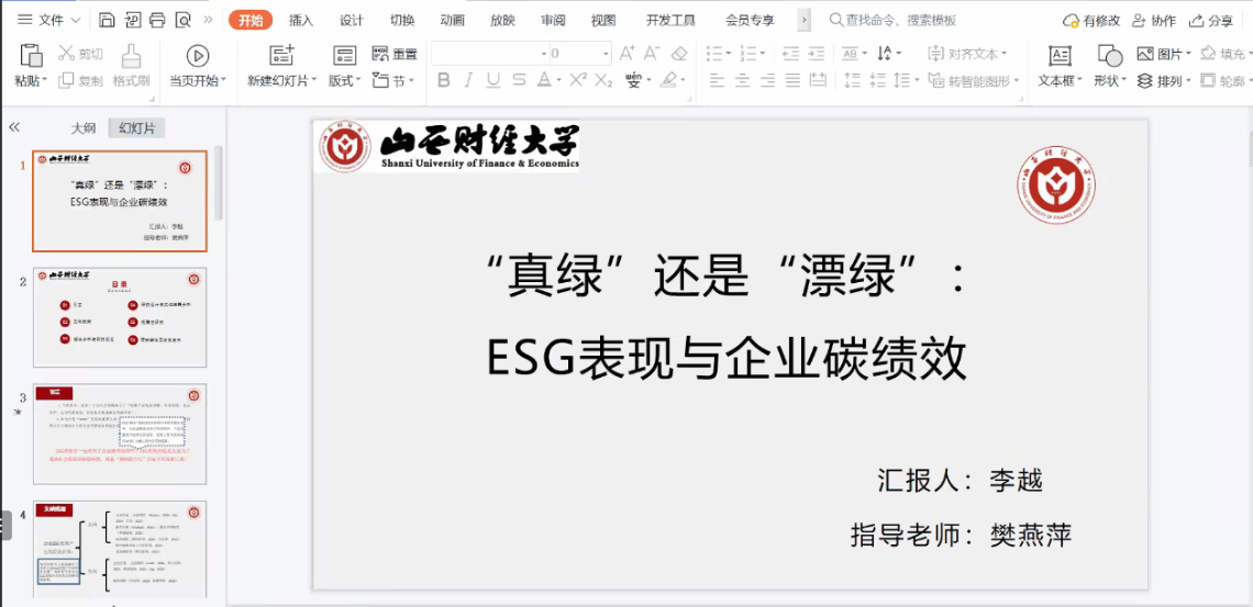 最后,硕士生李越汇报了工作论文《“真绿”还是“漂绿”:ESG表现与企业碳绩效》。上官泽明老师认为本篇论文的文献梳理比较详实,但是论文有比较强的反向因果问题,变量滞后一期不能很好的解决反向因果问题,所以内生性和稳健性检验部分有待提升。宋璐老师认为论文的基本关系需要进一步验证,工具变量的合理性缺乏文献支撑,调节效应的框架混乱以及经济后果检验所用的指标与控制变量的指标重复。