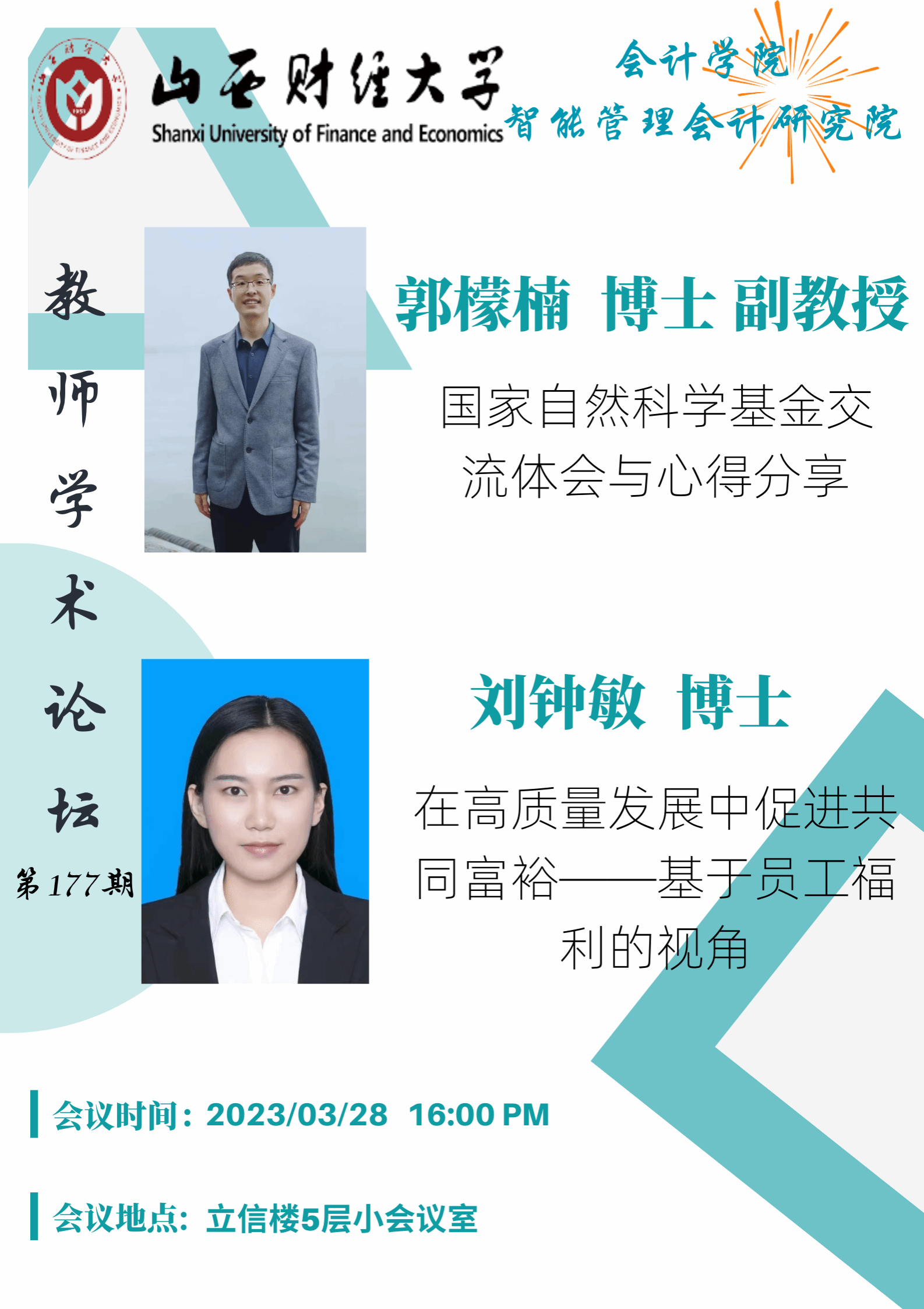 与智能管理会计研究院联合举行了第177次学术论坛。本次论坛主要内容包括两项内容:郭檬楠老师汇报国家自然科学基金交流体会与心得分享;刘钟敏老师汇报国家项目情况。