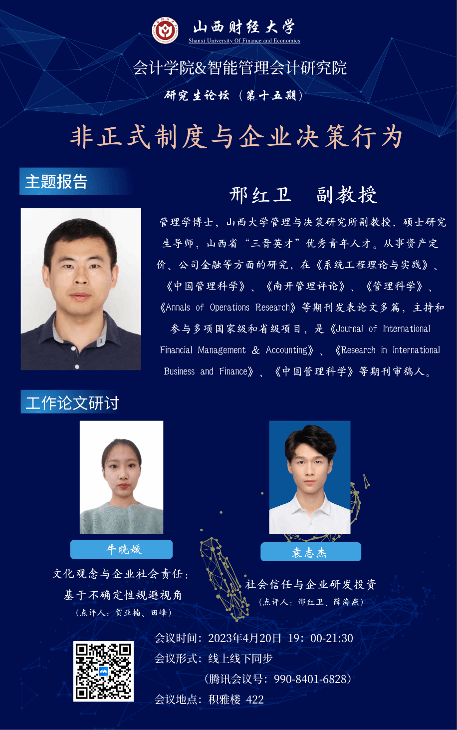 与智能管理会计研究院联合举办的研究生论坛(第十五期)以线下线上两种方式同步举行。本次学术论坛的主题为“非正式制度与企业决策行为”,轮值主持人为智能与成本管理教研室主任贺亚楠副教授、副主任田峰博士,论坛特别邀请山西大学管理与决策研究所邢红卫副教授做主题报告。