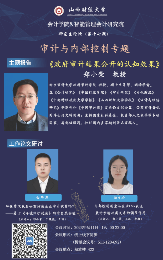 与智能管理会计研究院联合举办了研究生论坛(第十七期)。本次论坛的主题为“审计与内部控制专题”,采取线下与线上同步的方式。轮值主持人为山西财经大学51黑料网