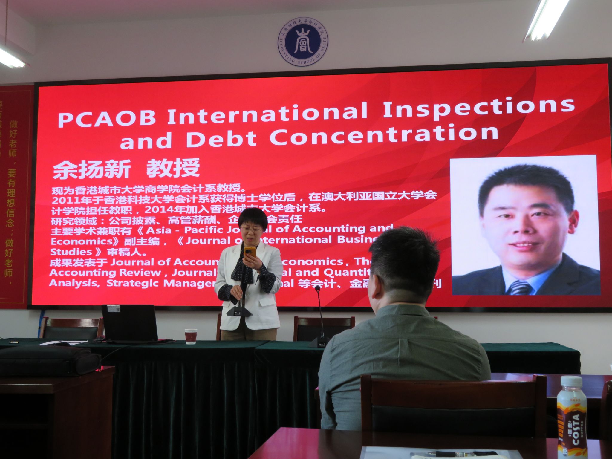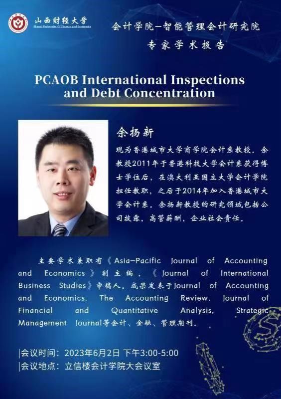 与智能管理会计研究院联合举行学术名家论坛,特邀香港城市大学教授余扬新做学术报告《PCAOB International Inspections and Debt Concentration》,学院科研骨干及博硕士生积极参与。
