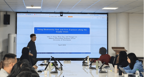 师生带来了一场题为《生物多样性与企业供应链》的学术报告。高教授通过对生物多样性政策及其影响的解析,深入研究了企业如何通过调整供应链组成来应对生物多样性的转型风险,同时探讨了供应链调整的利弊。报告内容丰富,视角独特,引发了在场师生的热烈讨论。