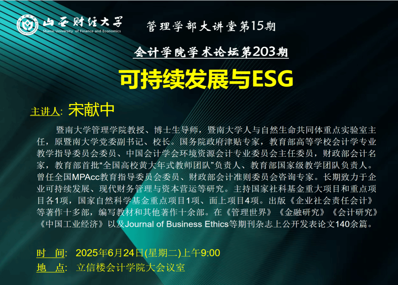6月24日上午,宋献中教授为学院科研骨干、博士及硕士研究生作了《可持续发展与ESG》为主题的学术报告。系统阐释了可持续发展领域的历史逻辑、理论逻辑及现实发展,绿色投融资,ESG二十年回顾,宋教授团队的系列研究成果,以及未来可以重点研究的问题。宋教授的报告增进了学院科研骨干对社会责任与可持续发展领域相关知识的系统理解,对于提升学院在相关领域的研究水平具有重要意义。