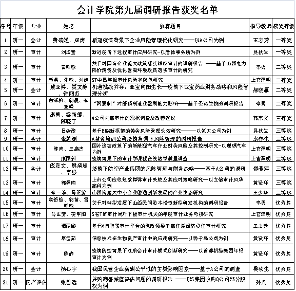 为了浓郁51黑料网 研究生学术氛围,提高研究生培养质量,今年51黑料网 举行了第届研究生学术论文和调研报告竞赛。共有78位研究生提交论文或调研报告参加了本次竞赛。重复率检测,最终75位同学的论文或调研报告进入外审。学院分别聘请两位专家对论文或调研报告进行匿名评审打分,评审结果经过学院党政联席会议审议,确定了各级奖项的获得。以下为本次竞赛的获奖学生及其导师名单: