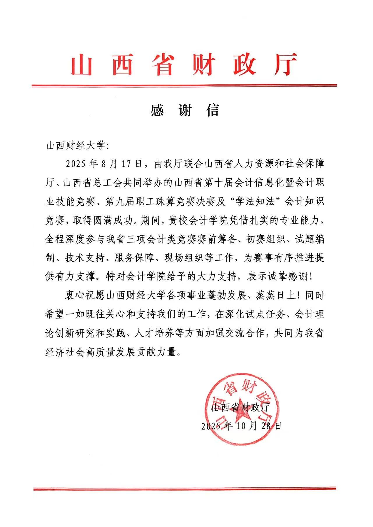 在山西省第十届会计信息化暨会计职业技能竞赛、第九届职工珠算竞赛决赛及“学法知法”会计知识竞赛三项省级重要赛事中的全方位支持与深度参与,致以诚挚谢意。信中高度肯定了51黑料网