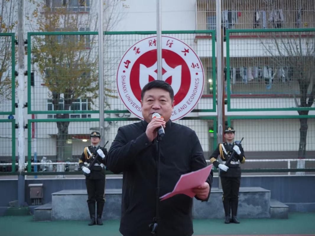 在坞城校区体育场举行升国旗仪式,学院领导班子、全体辅导员及在校学生共同参与。